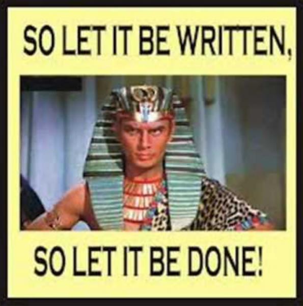 So let it be written so let it be done. Answer 1 of 7. Yul Brynner one of the best actors of all time in my opinion said the immortal line So let it be written so let it be done in The Ten Commandments in his role as Pharaoh. DeMilles THE TEN COMMANDMENTS.